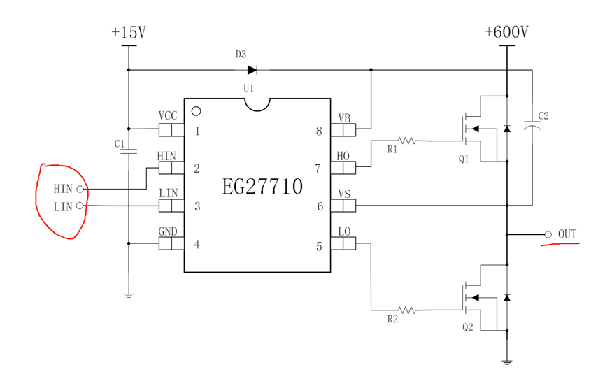 EG27710 典型应用电路图,三路同样的电路组成了BLDC电机驱动。其中三路HIN和LIN是来自MCU的驱动信号,三路OUT接电机的U\VW。