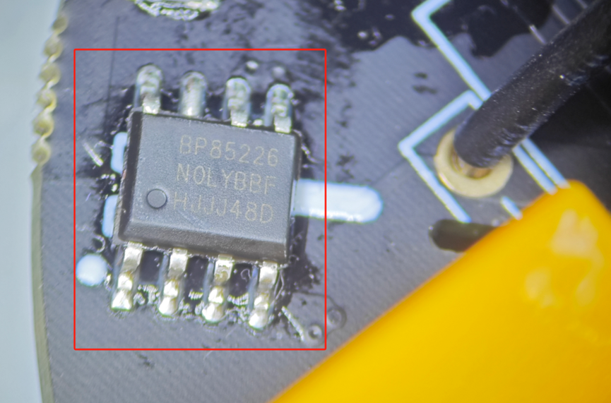 板子背面是生产批号和连接器,看生产批号是23年第52周,用的是SH1.0 5P连接器。板子上也预留了直接焊线的通孔焊盘。估计是评估下来用连接器的生产效率更高,整体成本更低,所以现在看到的这个用的是连接器。