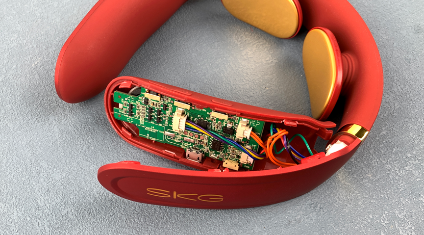 这样的话,连接到金属片电极上这个绿色的线,应该就是用来释放电流的。两个电极片都和皮肤接触之后,就形成了电流回路。怪不得戴上它按摩会有酥麻的感觉。