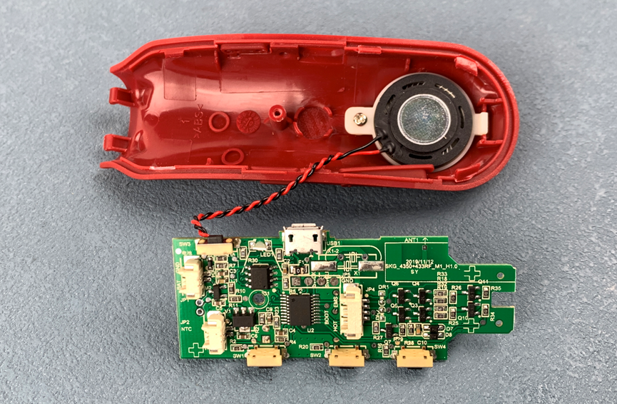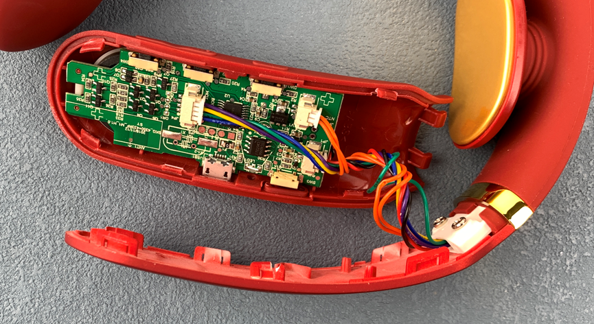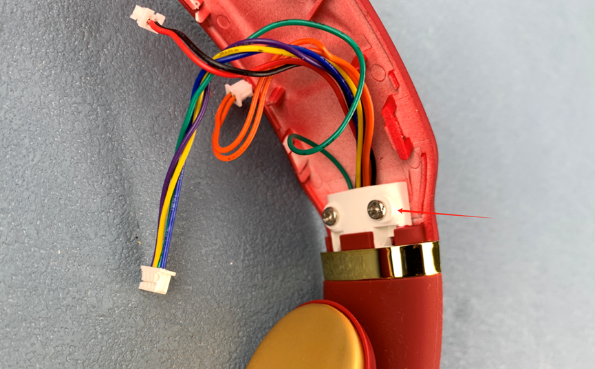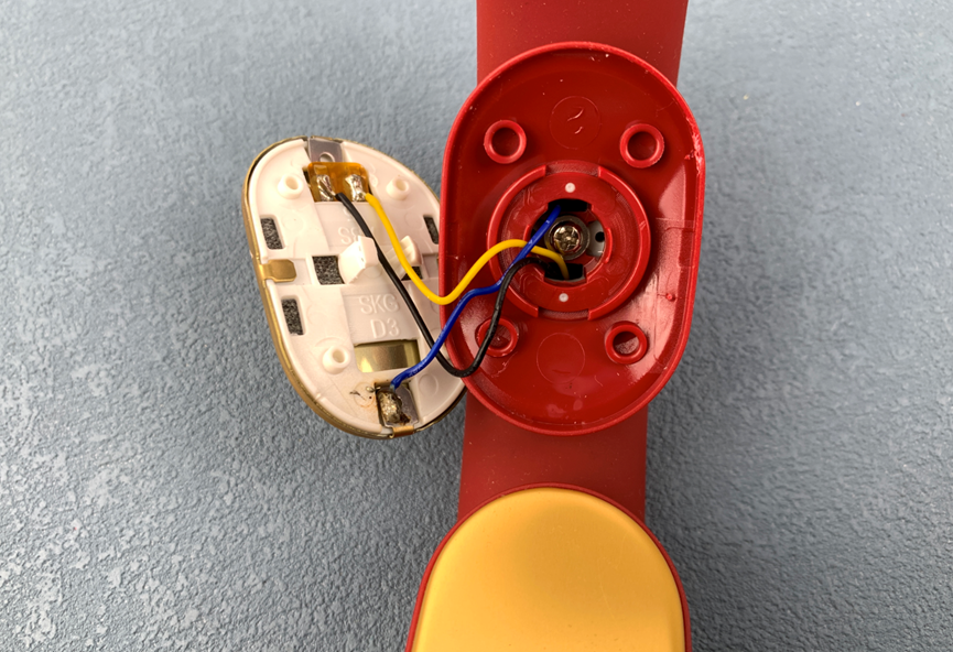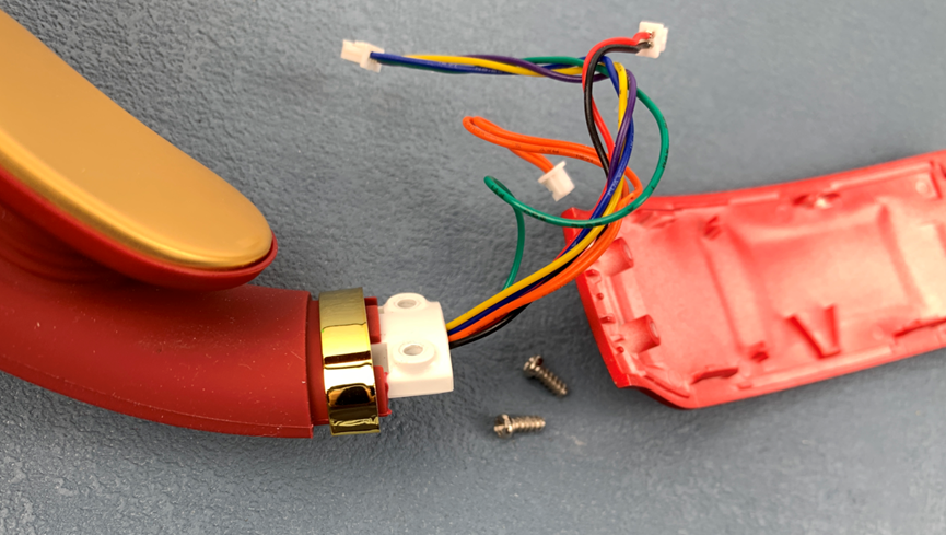 再次回到外壳拆解,这次我们拆掉一个按摩头。下面有三个线,一根接到了外壳上面,就是看着像塑料的那个黄色金属电极片上,另外一根黑的一根黄的接到了一个FPC软排线上。