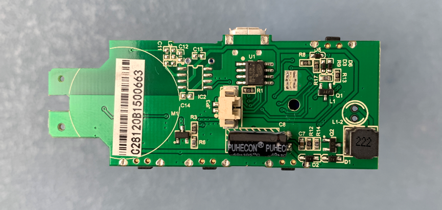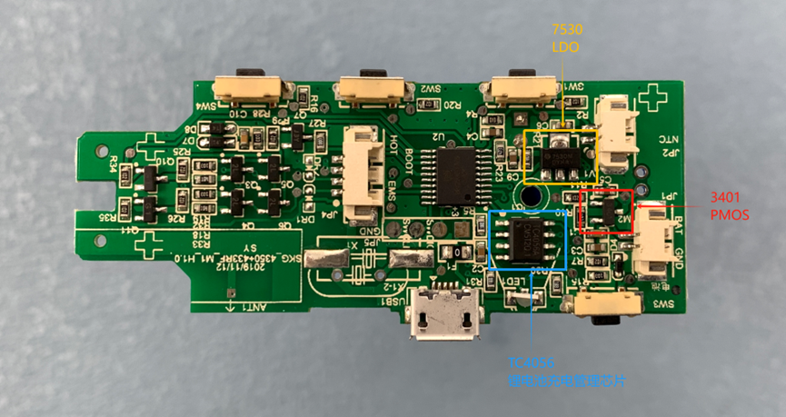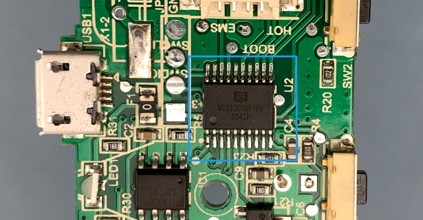 板子中间这个芯片,费了九牛二虎之力,通过各种打光尝试、调整角度尝试,总算拍清楚了,型号是ME32S030F6P6,这是来自敏矽微的一颗32位MCU。