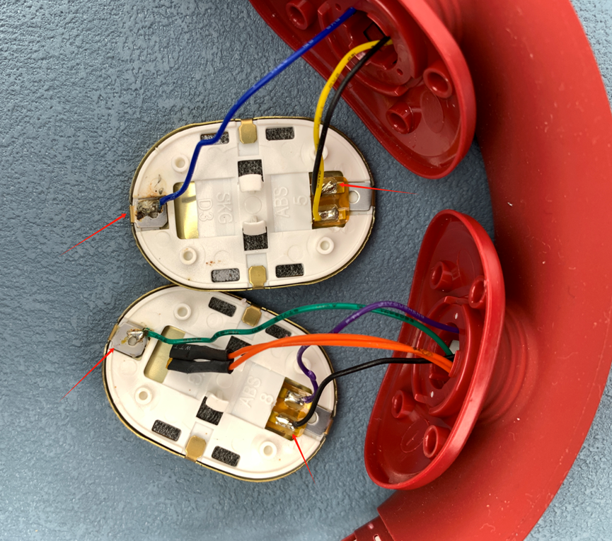 再把另一个按摩头的电极片拆掉,可以看到,绿色的线连接到了电极片上,另外这个电极片多了两个橙色的线。