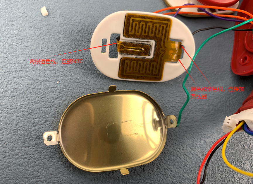 拆掉电极片,可以看到下面有一个FPC上是蛇形走线,这个是用来加热的。那么,两个按摩头的加热丝用黑色的线连接在一起就是串联了。而另外两根黄色的线,连接到了电极片中间的这个NTC热敏电阻上,用来测量温度。