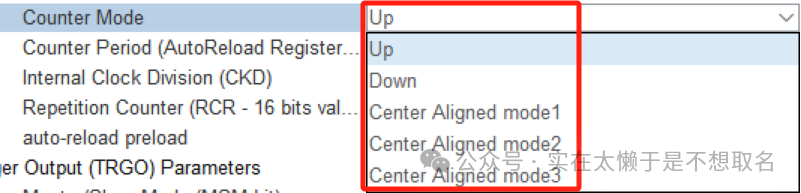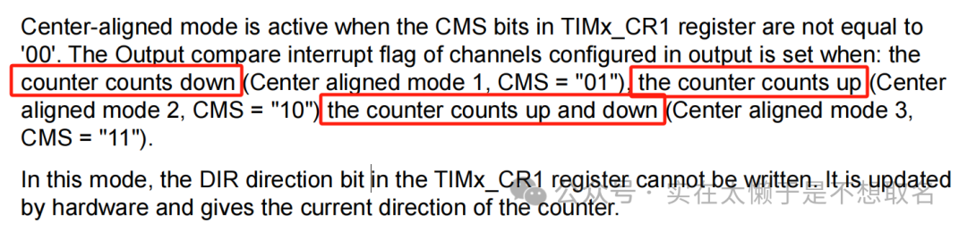 对于中心对齐模式分的比较仔细,提供了三种中心对齐模式,这其实对应了三种中断触发方式,这里以后有机会会在PWM中再仔细介绍,这里略一下。