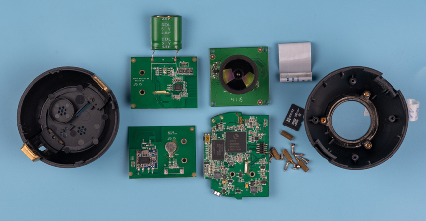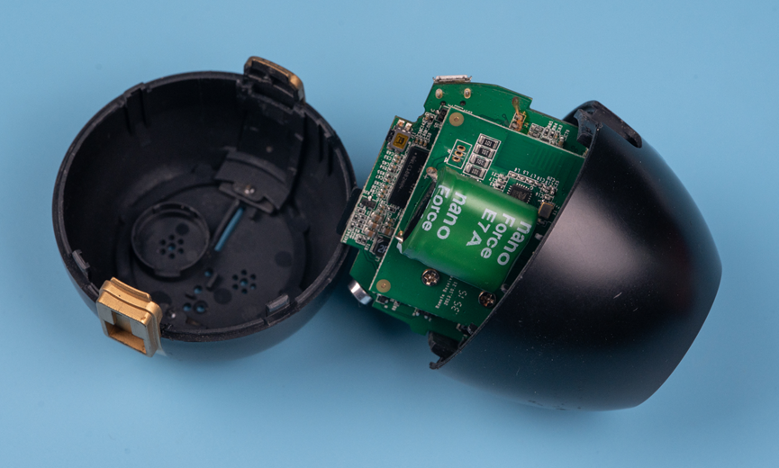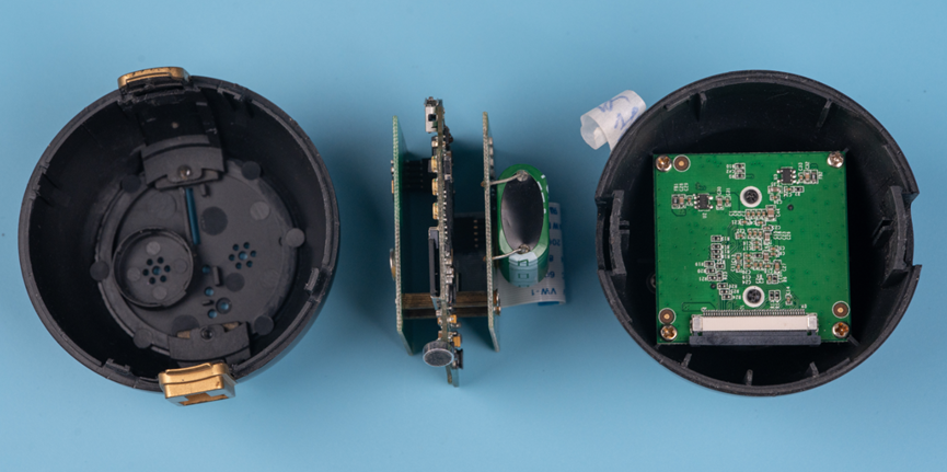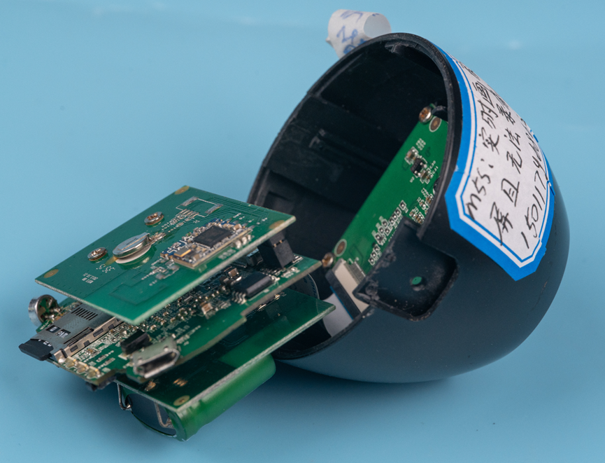 先对这个产品的组件有一个大概的认知。两个蛋壳包裹了里面的四个电路板。其中三个电路板通过叠层的方式连接在一起,中间的是主板,主板和摄像头子板是通过FPC排线连接。