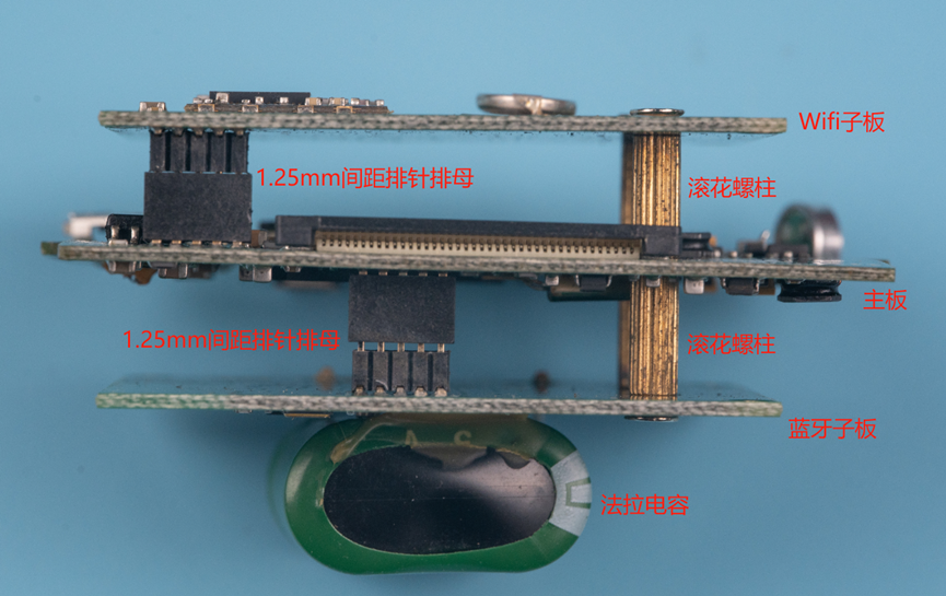 这是三个板子的层叠图,最上面是Wifi子板,中间是主板,最下面的是蓝牙子板,板子之间使用滚花铜螺柱连接,电源和信号通过1.25mm间距的排针排母连接。