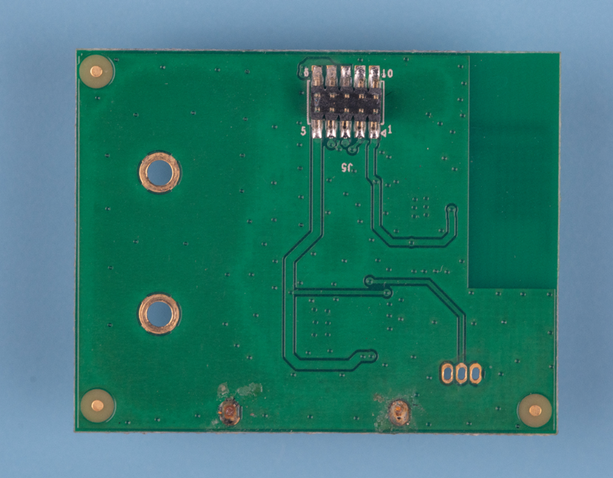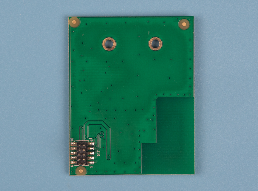 最底下的蓝牙子板,背面仍然只有一个1.25mm间距的贴片双排排针。以及右上角未铺铜皮的蓝牙天线净空区。