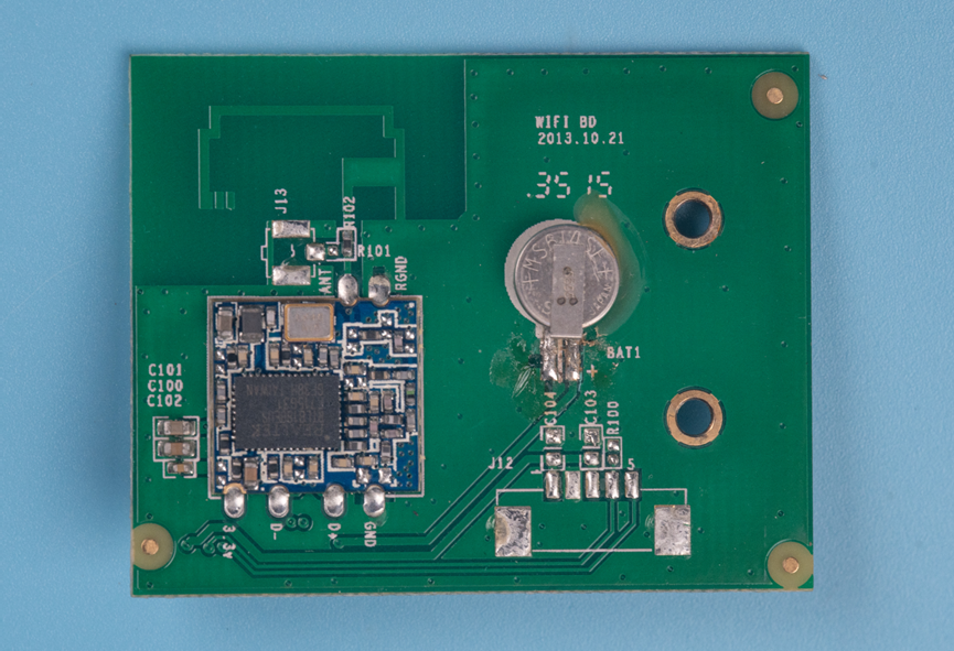 Wifi子板正面,有一个小电池。另外就是一个Wifi模组,这边果然有Wif的PCB天线。看样子这个Wifi模组是USB转Wifi的,只引出了USB信号和电源信号以及天线信号。PCB板是15年35周生产的。Wifi模组上的芯片是REALTEK的RTL8188。