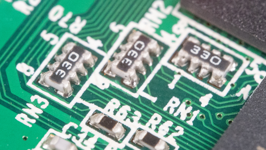DDR走线上串联了33欧的电阻,用来做阻抗匹配,防止信号反射。33欧电阻用的是贴片排阻。