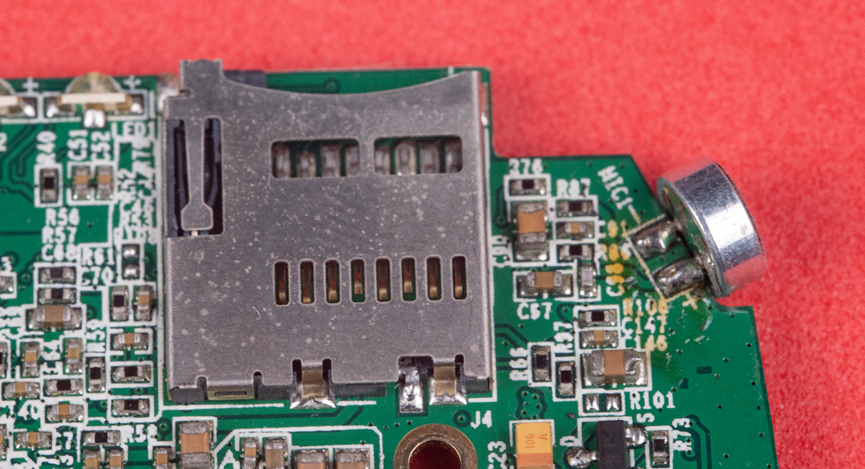 SD卡槽用的是这种引脚在肚子底下的。旁边板子角角的柱状金属体是麦克风传感器。