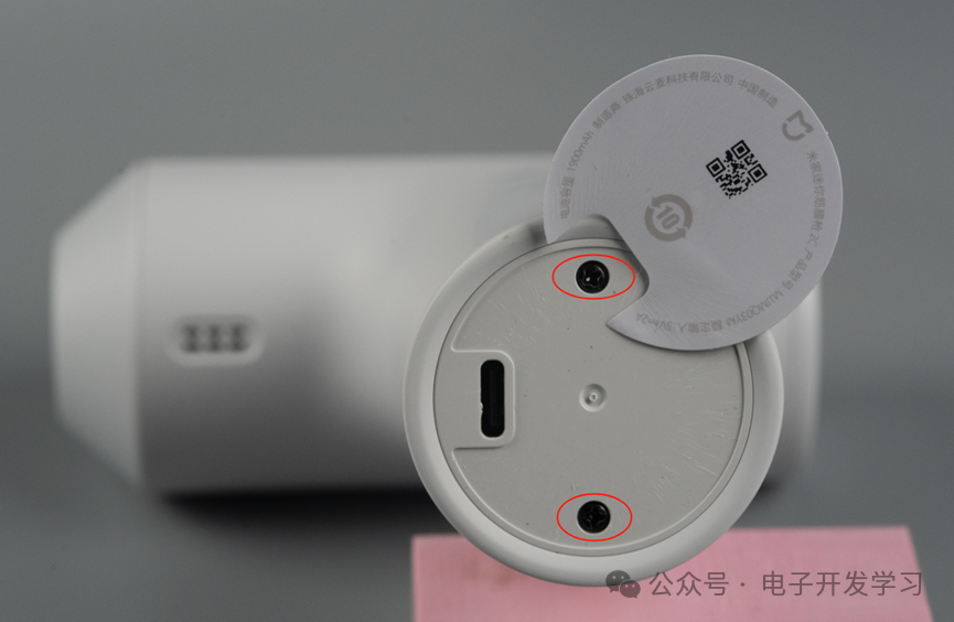 再往下拆解发现无从下手。于是观察一番,发现手柄尾部有贴纸,按照多年的拆解经验来看,贴纸的下面必然会有螺丝。拿掉贴纸果然有两颗螺丝。