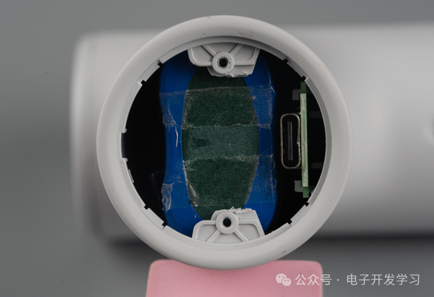 拆下螺丝拿掉手柄尾盖之后,发现电池刚好被安装螺丝的两个耳朵堵住,而且内部结构设计导致电池无法转动,因此这个电池肯定不是从手柄尾端抽出。