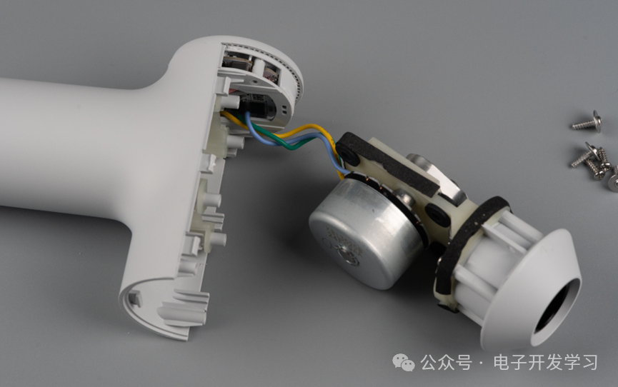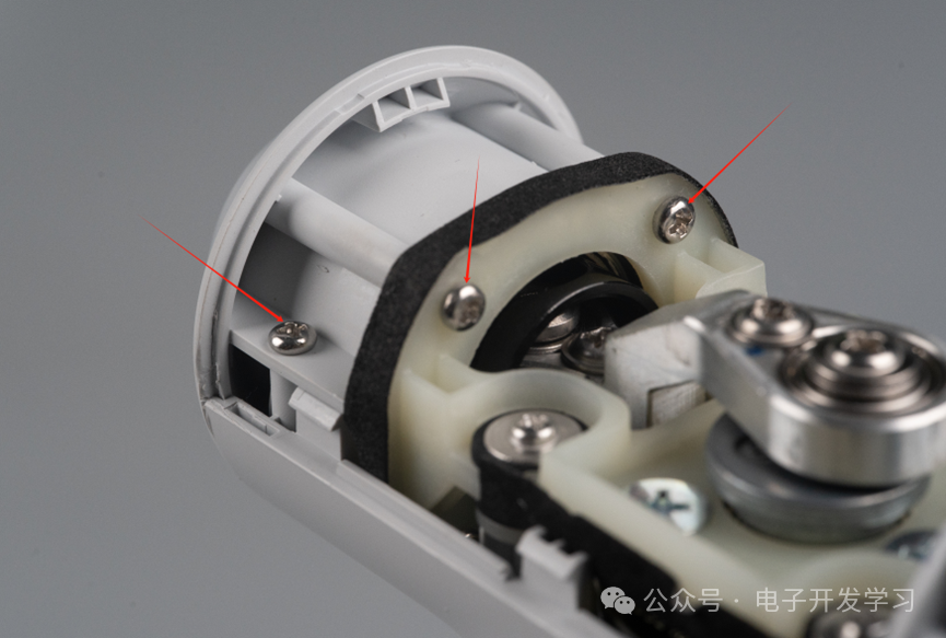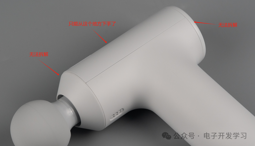同理,前端的按摩头安装口也是通过多个螺丝固定在主壳体上,无法拆卸。