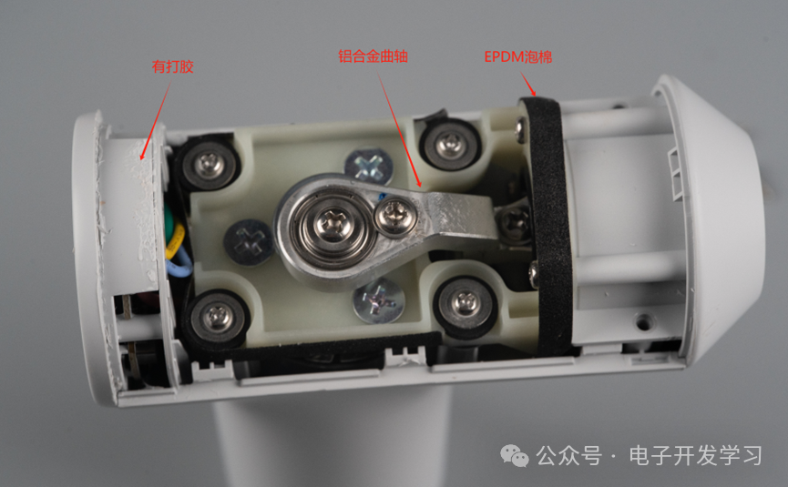 刚才拆解的顶盖除了卡扣固定还有打胶,曲轴是铝合金材质的,前面还加了EPDM泡棉。看起来,这个2C在结构上的用料和3是差不多的,确实只是尺寸缩小了一些。