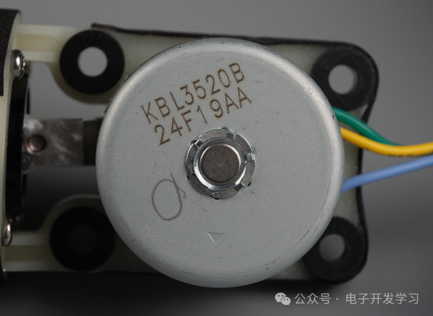 把震动部分整体拆下来,红黄蓝三根线是从尾部的电路板连接到电机,看起来这个电机的驱动没有集成在电机上。无刷电机型号是KBL3520B,直径35mm,厚度20mm。
