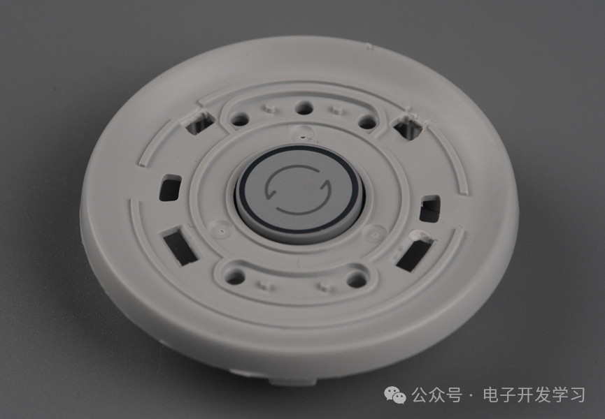 按键材质是半透明的,外侧有缓冲悬臂,悬臂最外端固定在端盖上,固定处有打胶。