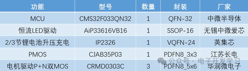 主控芯片是来自中微半导体的ARM Cortex-M0+内核的CMS32F033。这个芯片实现了筋膜枪的控制逻辑、电机驱动等等。电机驱动采用的是三颗P+N的MOS构成的H桥实现,采用P+N的H桥好处是上管不需要自举驱动电路。这个筋膜枪的电池是两颗18650锂电串联,所以电压是7.4V,这里采用了英集芯的IP2326来完成两节串联锂电池的升压充电。这里有用到一颗江苏长电的PMOS来实现电机母线电源开关,型号是CJAB35P03。前面这些其实都很容易理解,常规操作。但是我一开始没理解的是,这个板子上为啥有一个SSOP-16脚的恒流LED驱动芯片。