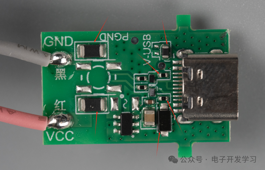 这是手柄底部的Type-C充电板,CC1和CC2上都有5.1K下拉电阻,看来不管插到多大功率的充电器上都只能诱骗到5V电压进行充电。电源和地线上串了磁珠,Type-C连接的壳和地之间也串联有磁珠。USB信号引出之后,有对地的TVS二极管,之后信号通过串联电阻之后打孔到板子背面。