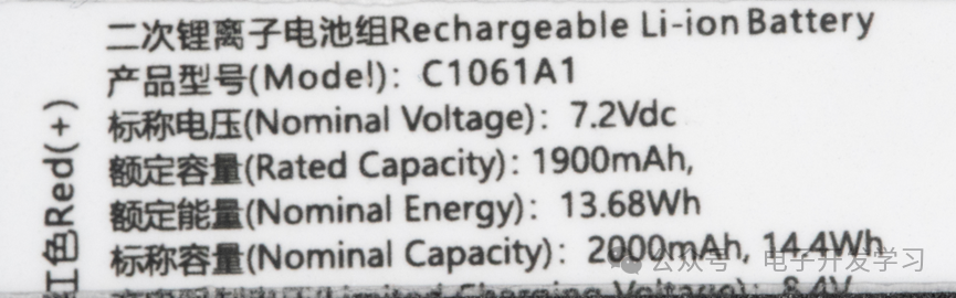 电池上的参数,产品型号C1061A1,标称电压7.2V,额定容量1900mAh。