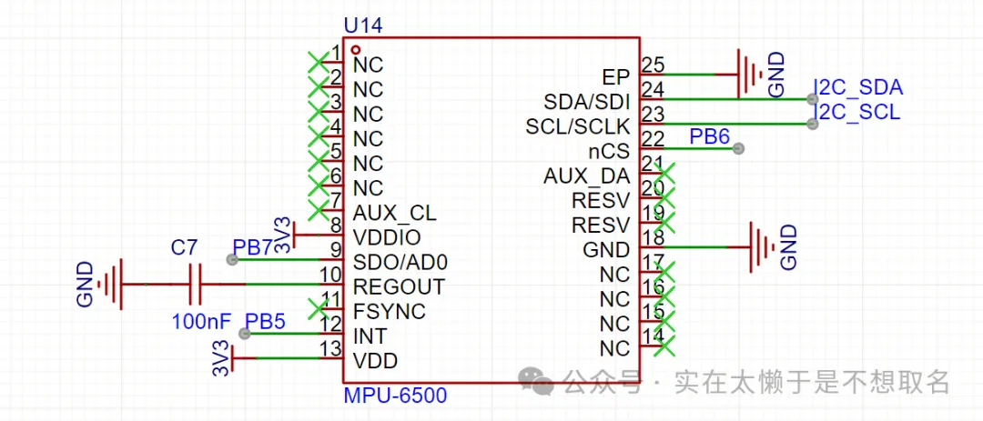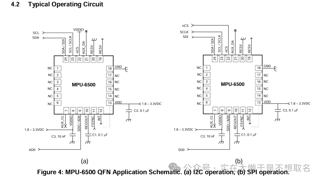 MPU6500的外围电路比较简单,其中SDO/AD0在I2C通讯中用于决定器件地址的低位。nCS引脚用于决定通讯方式,启用I2C通讯需要拉低nCS。