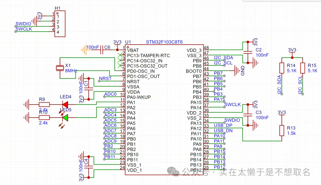 主控采用STM32F103C8T6作为主控制器,并且启用USB外设和上位机通信,I2C上拉俩电阻。