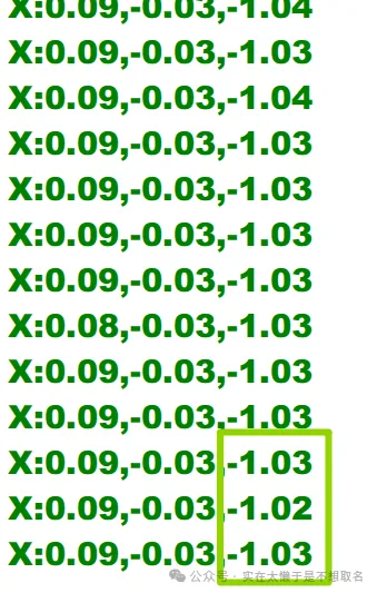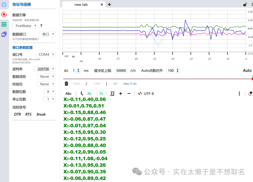 在VOFA+中测试XYZ轴的加速度计数据,一切正常,我们调转陀螺仪方向,让其平放:
