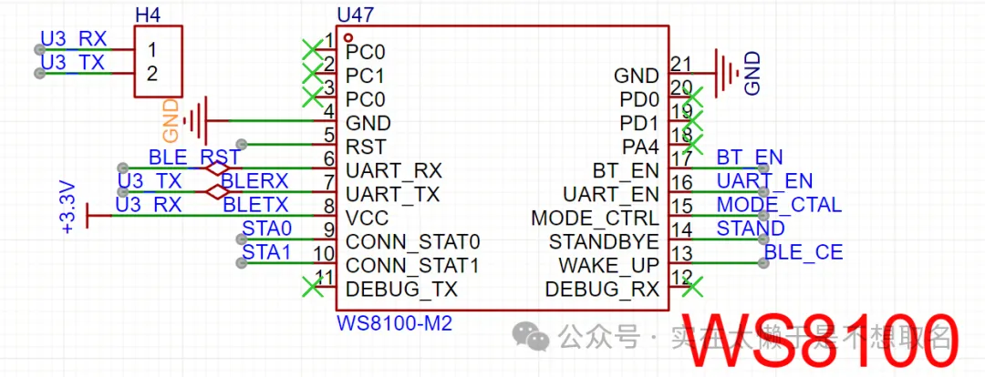 在我的毕业设计中,为了完成和手机的蓝牙通讯,特意为单片机添加了一块BLE蓝牙芯片:WS8100,才能让主控STM32U0具有无线通信的功能。