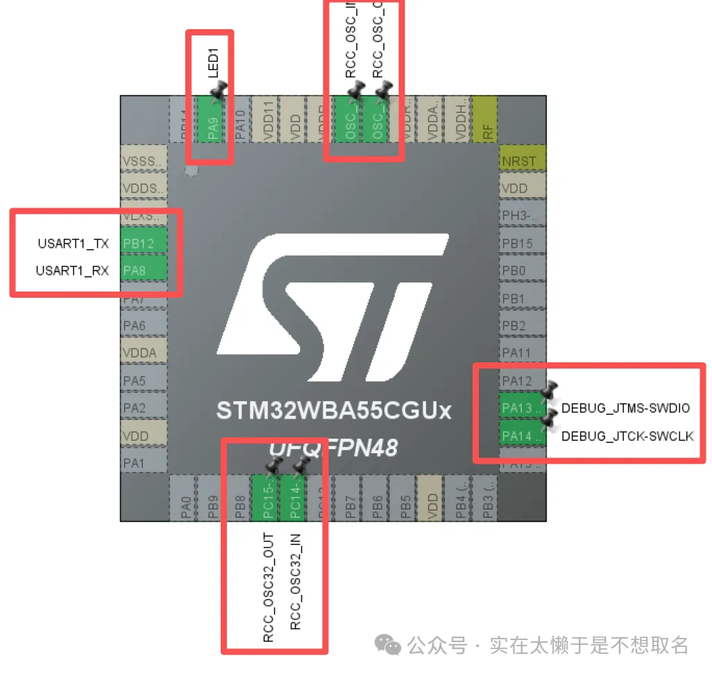 WBA的基本外设要开启:串口、Debug下载口(防止二次烧录失败)、外部高速时钟、外部低速时钟以及一个LED灯用于调试。