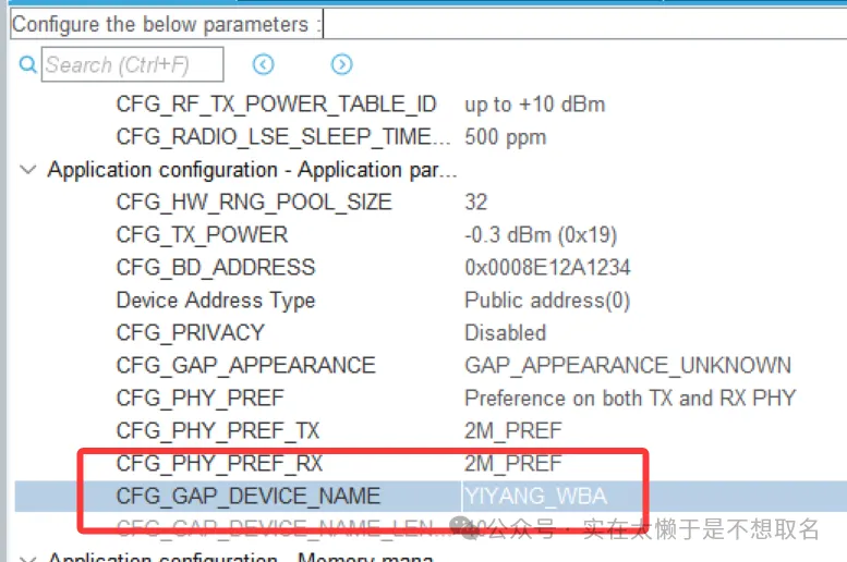 修改一下BLE设备的名称,之后我们还要设置一些基本广播配置,广播配置将是我们能够搜索到BLE设备的关键信息。