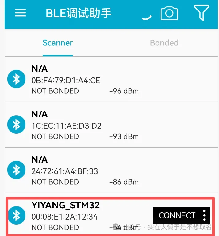 运行代码之后,我们就可以在BLE调试助手中看到我们周围的BLE设备,其中可以看到STM32WBA的广播名称:YIYANG_STM32。