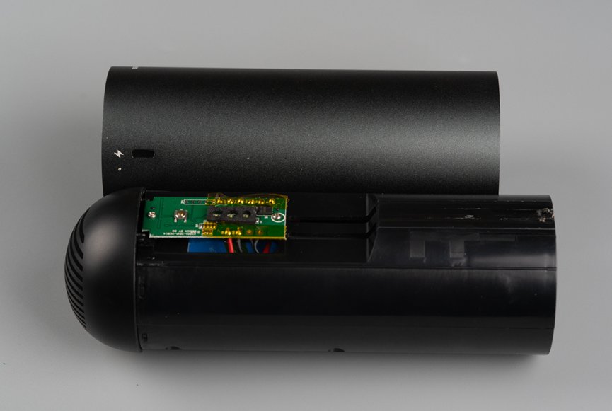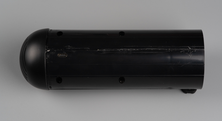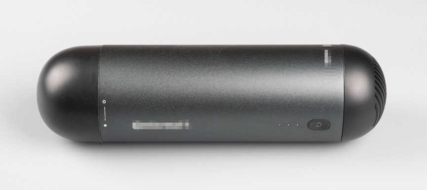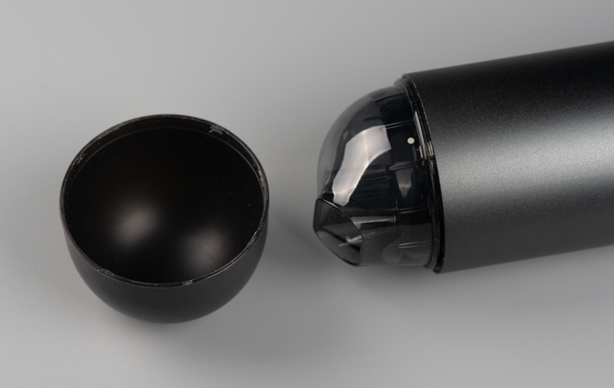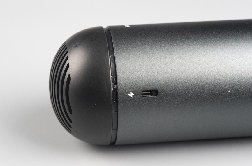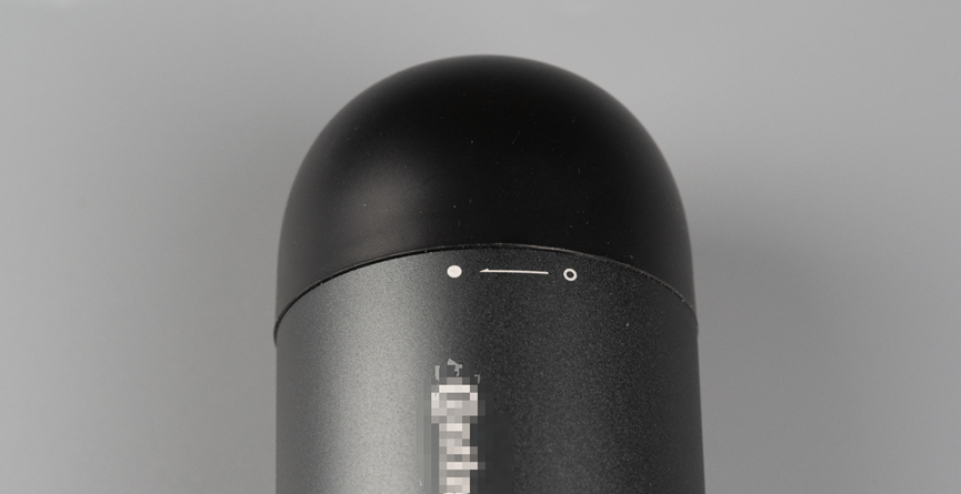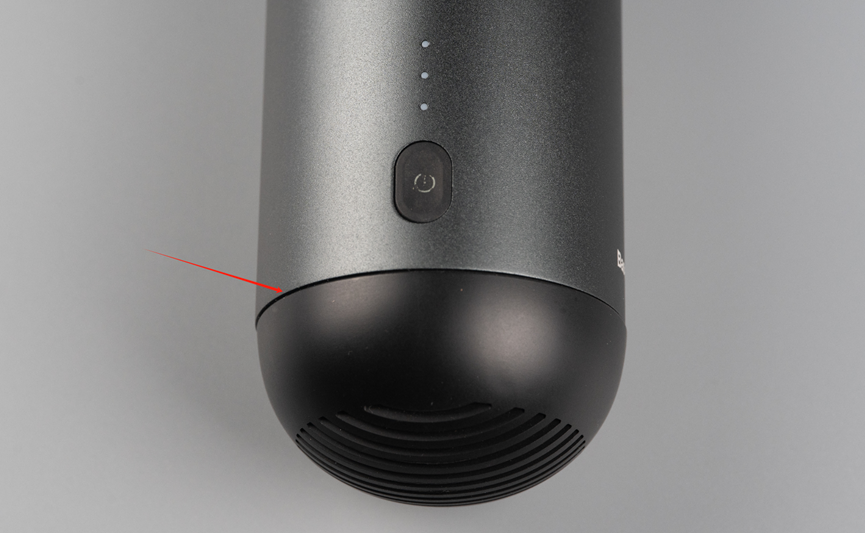 这端是开关机按键和指示灯,以及排风口。这个半球形的排风口是塑料材质的,仔细看发现这个排风口和铝合金筒身的结合不是很紧,缝有点大,还有点歪。