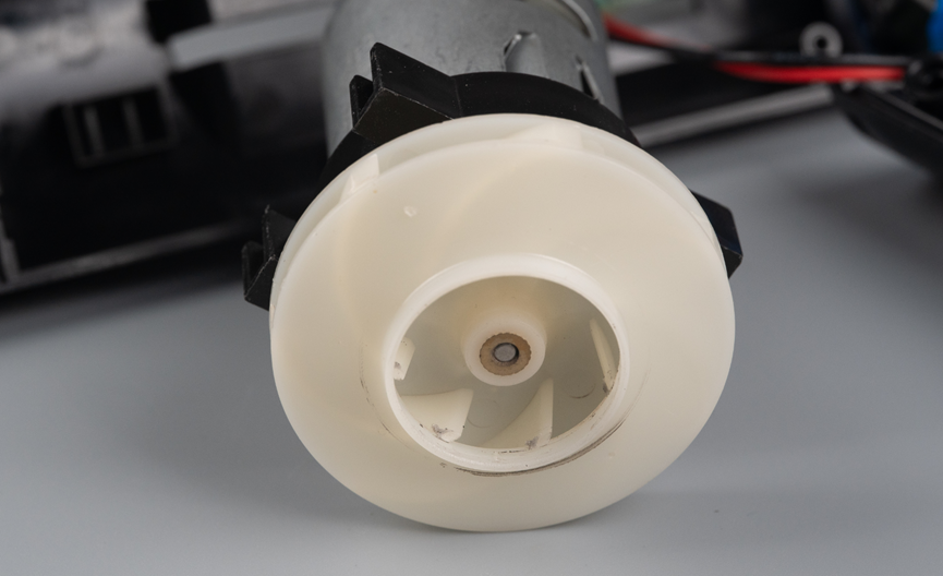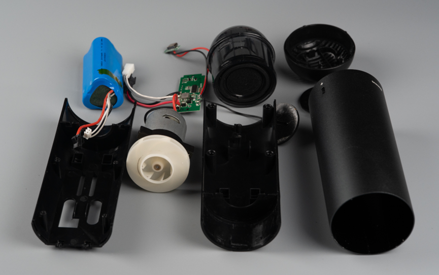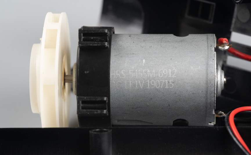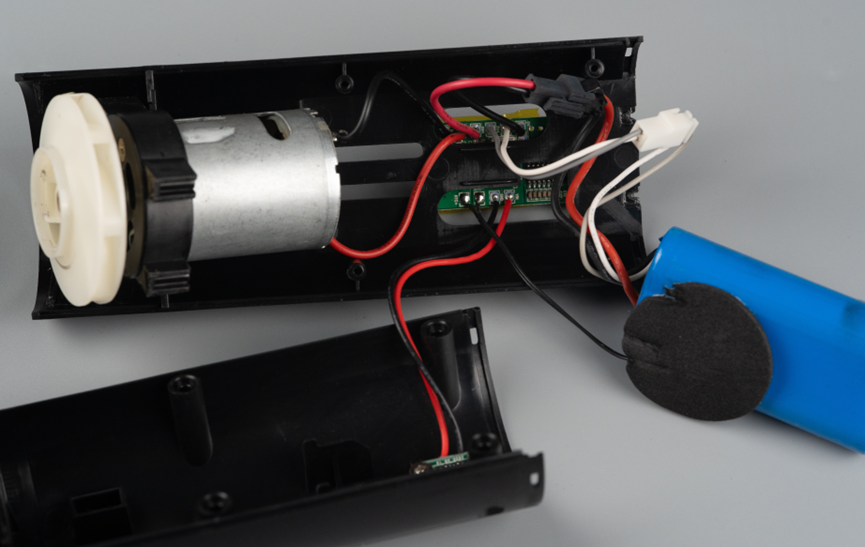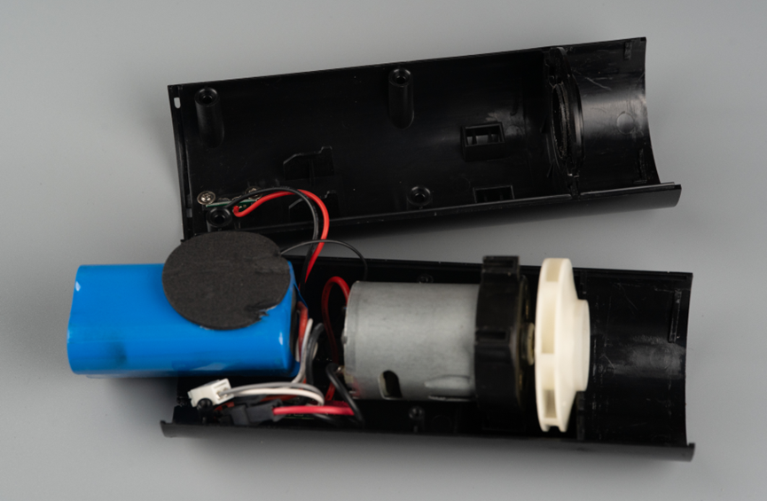 很快,这个筒体也被我掰开了,里面的东西比我预期的简单。一个有刷电机带个风轮。另外就是个3S锂电池了,除此之外,空空如也。