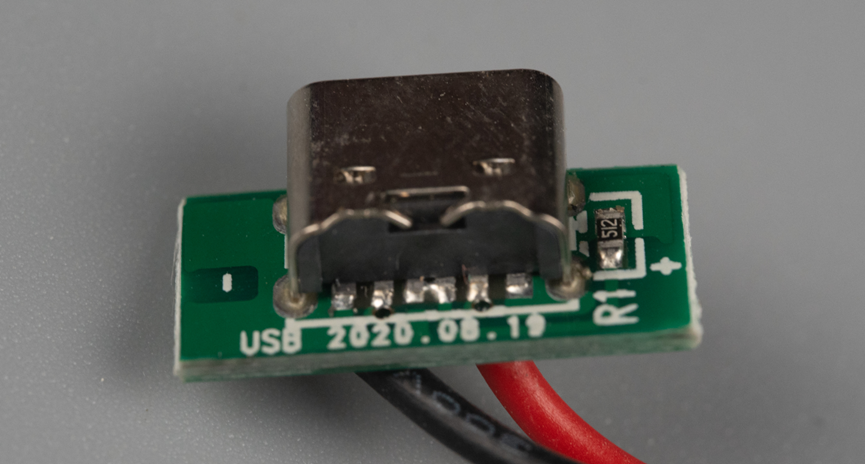 Type-C充电小板,用的是6pin的连接器。中间两个引脚连在一起之后引出,接了一个5.1k的下拉电阻。实际上,这样设计是不对的,中间两个引脚分别是CC1和CC2应该分别接一个5.1K的下拉电阻,而不是把CC1和CC2连接在一起再下拉。
