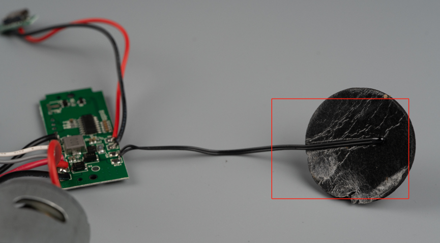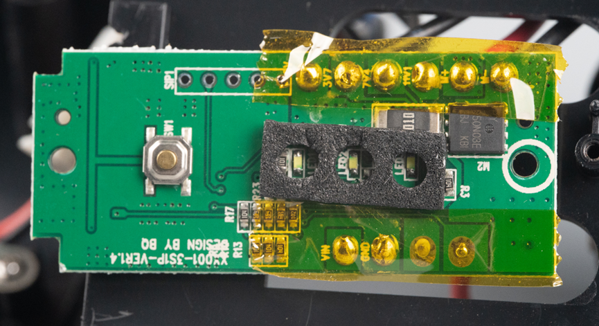 电路板。正面是一个按键,三颗LED指示灯,一颗MOS,一颗采样电阻。LED指示灯上加了防透光的EPDM泡棉。