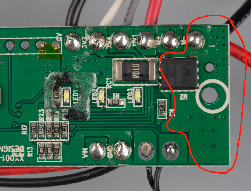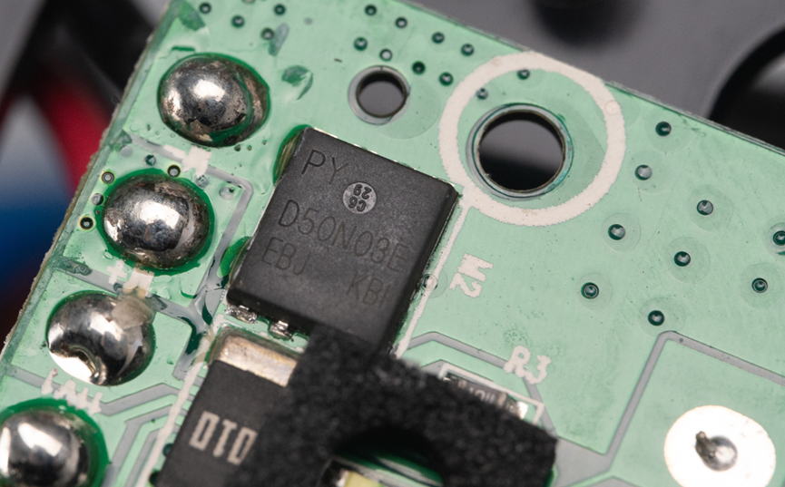 电机的负极回来之后,经过板子正面这个位号为M2的MOS之后,通过采样电阻回流到地。