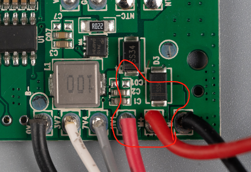 在仔细看,这个电池和电机的正极连在一起。旁边D3是电机的续流二极管,和电机并联放置。