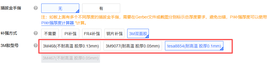 大家在嘉立创FPC下单的时候,都会看到【补强方式】中的【3M胶】选项!其中3M9077型号因具有良好的耐高温性能,成为大家的热门选择。