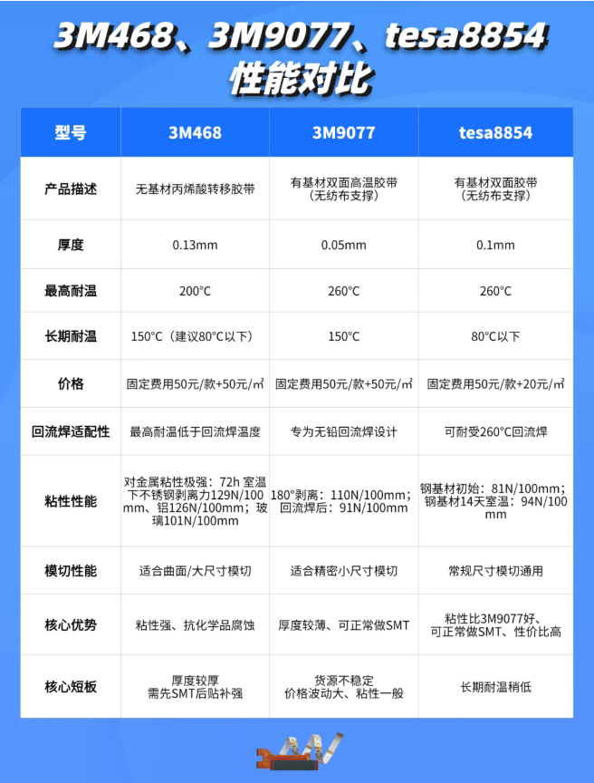 - 通用场景(消费电子、工业控制等),优先选择tesa8854——成本较低,货源充足,耐高温,能过回流焊,粘性也比3M9077要好。