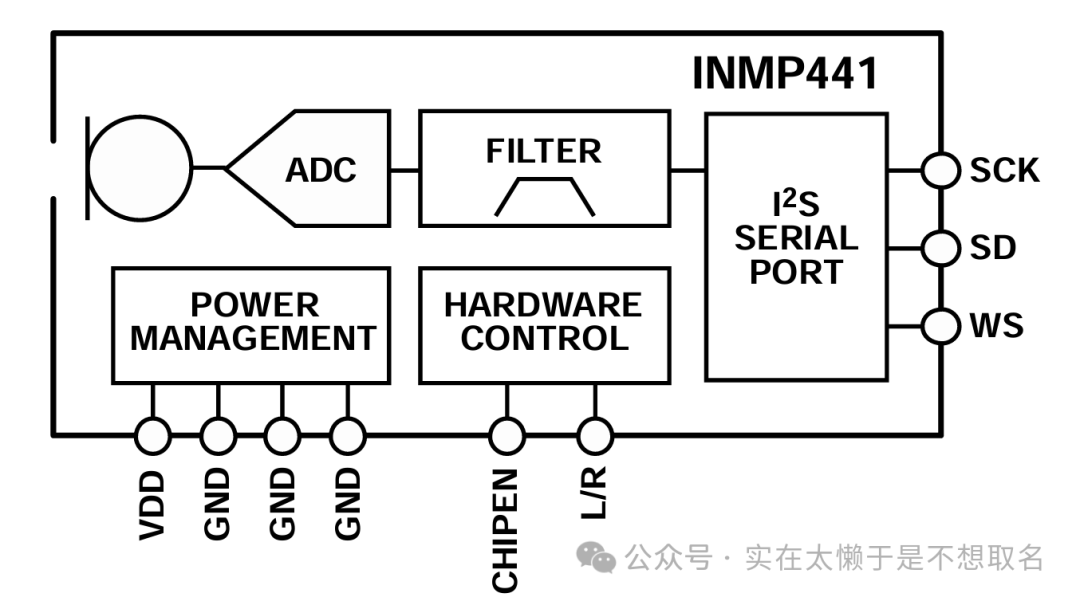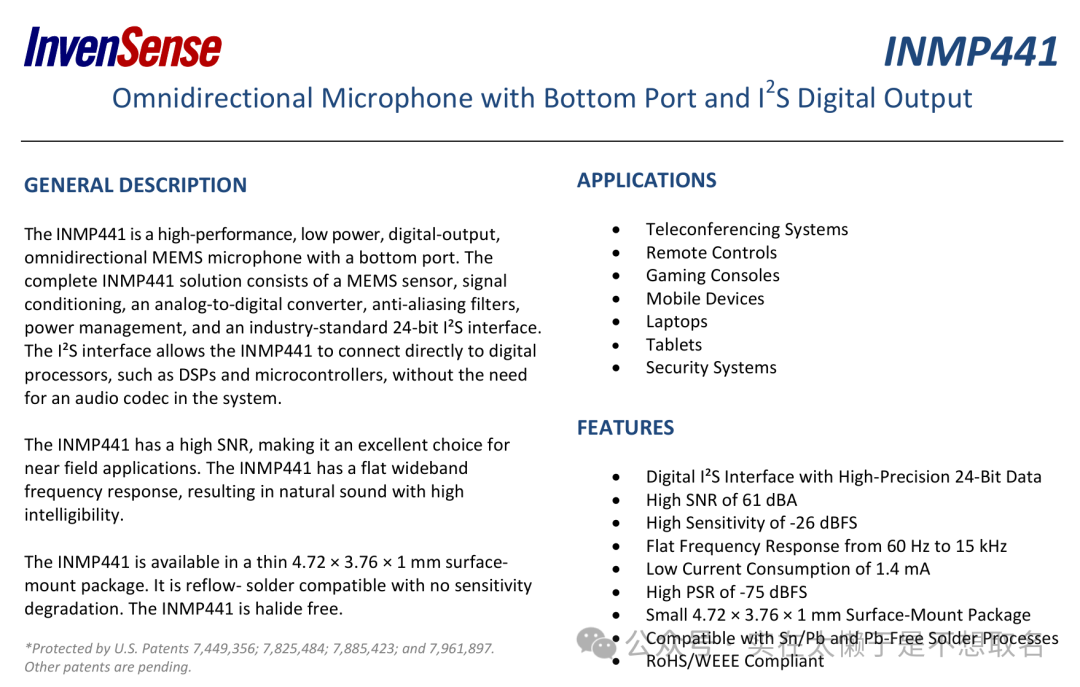 INMP441是TDK的一款全向MEMS麦克风,直接输出 I²S 格式的数字音频信号,省去了外部模数转换器 (ADC) 的需求。