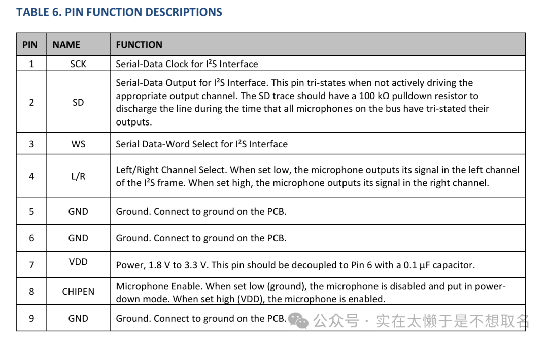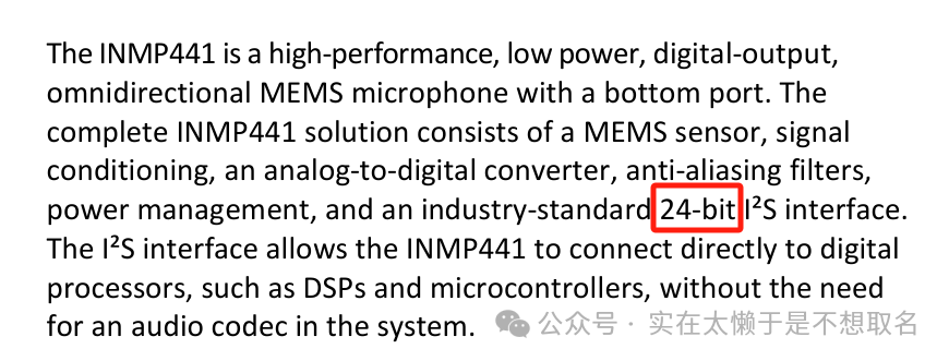 对于一个44.1KHZ,24位,双通道的I²S设备来说,它的时钟频率SCK计算公式应该是:44.1K*24*2。这个时钟频率对MCU来说是比较高的,因此一般是需要MCU有专门的I²S外设。下面我们介绍一款I²S的芯片:INMP441