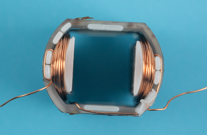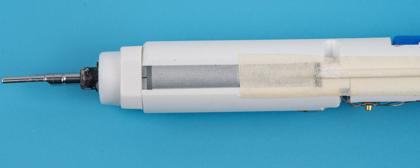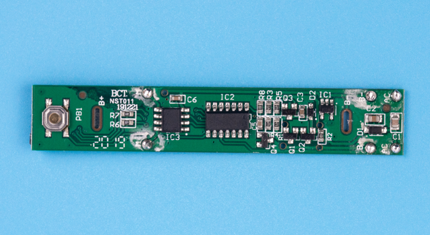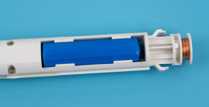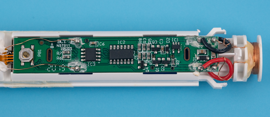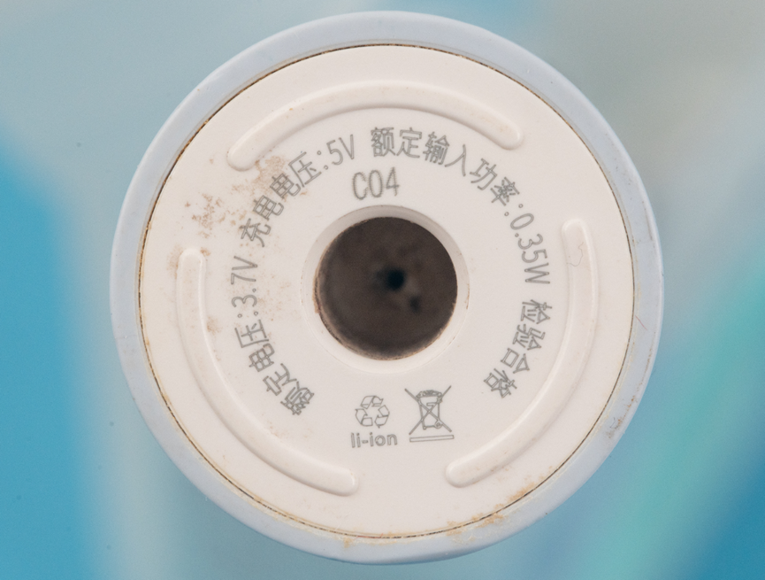 电路板背面是锂电池槽位。和其他电动牙刷的卡扣方式一样,它也是通过伸出两个卡扣卡在外壳上。尾部是充电线圈。