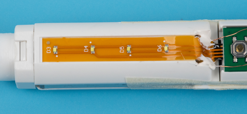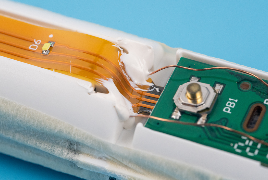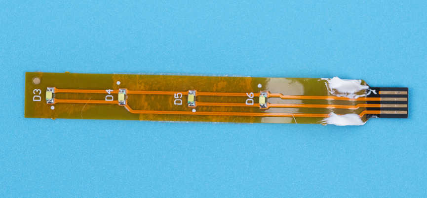 直观来看,电路板不是很复杂,四颗状态指示灯是做在一个FPC软板上的。
