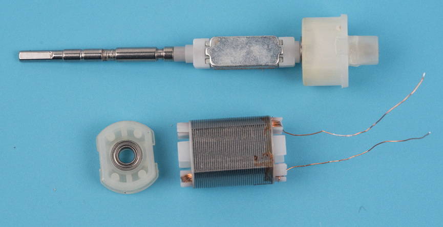 整个电动牙刷全家福。我后来与寄这个电动牙刷的网友联系得知,这个电动牙刷是4年前148买的,一支牙刷加5只刷头,用到最后无线充电座找不到了,而且时间也比较久了,就换新设备了。我个人认为,这个价格,这个做工,算是比较合理。最起码电动牙刷最核心的机构——震动马达,用的还不错,没有用那种最简单的614空心杯电机。当然,从电路板上的芯片用料来说,它肯定算不上多好,只能说符合大多数白色小家电的设计策略。但是这样一支牙刷加上5只刷头的卖家是148的话,而且使用四年多还没坏,对消费者来说还算比较友好的。