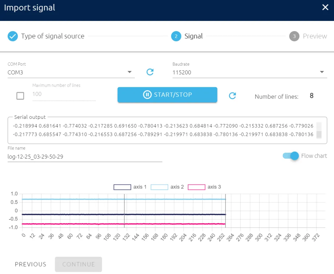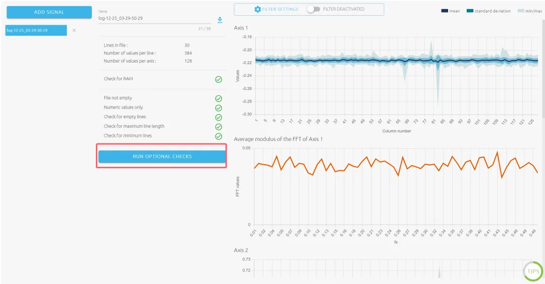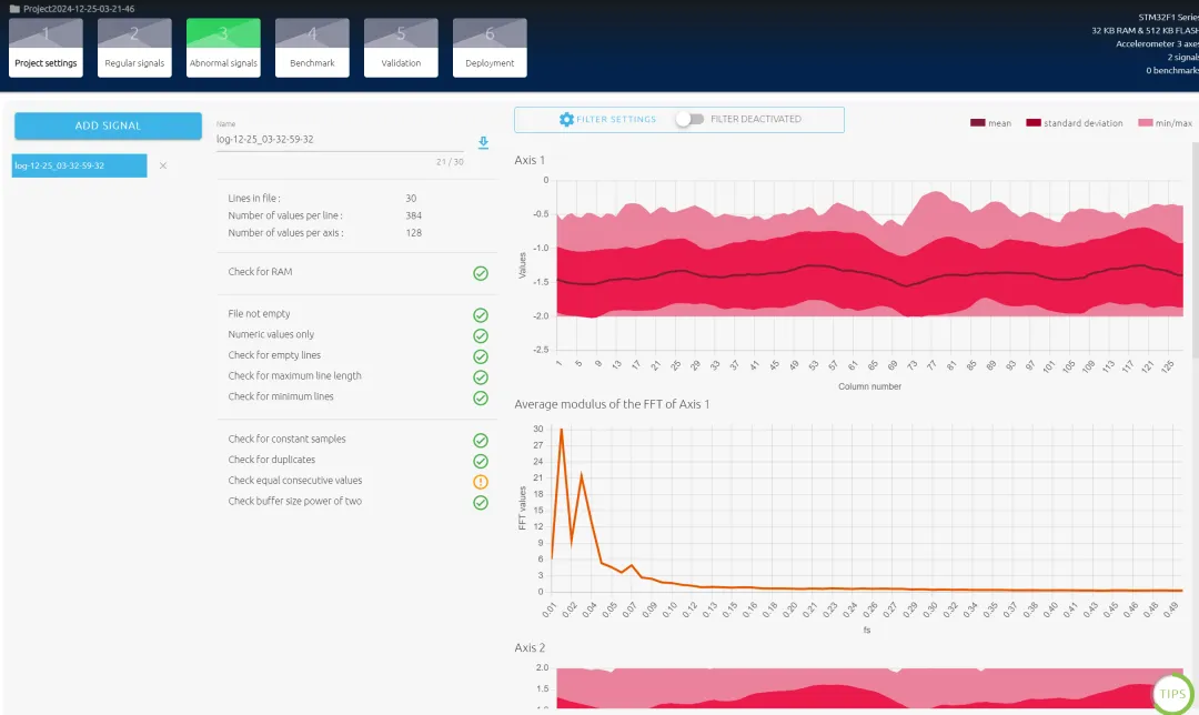 收集完足够的信号并分组检查之后,可以看到NanoEdge AI对我们的数据进行了离散傅里叶变换,将时域数据转换为了频域数据,这里需要注意最好采用2的倍数的数据量,比如128,256等。这也就是为什么NanoEdge适合于传感器数据的使用而不适合用于图像数据处理的原因。