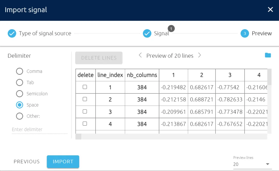 创建一个异常检测项目,芯片选择F1系列,限制一下芯片的RAM为20KB,Flash为64KB。传感器选择时间相关传感器,类型选择加速度计,轴数为3(XYZ)这里不得不说距离我上次使用NanoEdge已经有几个月过去了,NanoEdge也有很多的更新,包括中文字符的使用还有其他传感器类型。 第二步是输入正常情况下的数据,这里需要注意一下数据的输入格式如上图,每一行的每一个数据用空格隔开,最后以换行符作为一行的结束。这里的分隔符不一定要是空格,可以是逗号....但是一定要注意最后要用换行作为一行结束。而且不能是 数据 + 分割符号+换行符 结束。