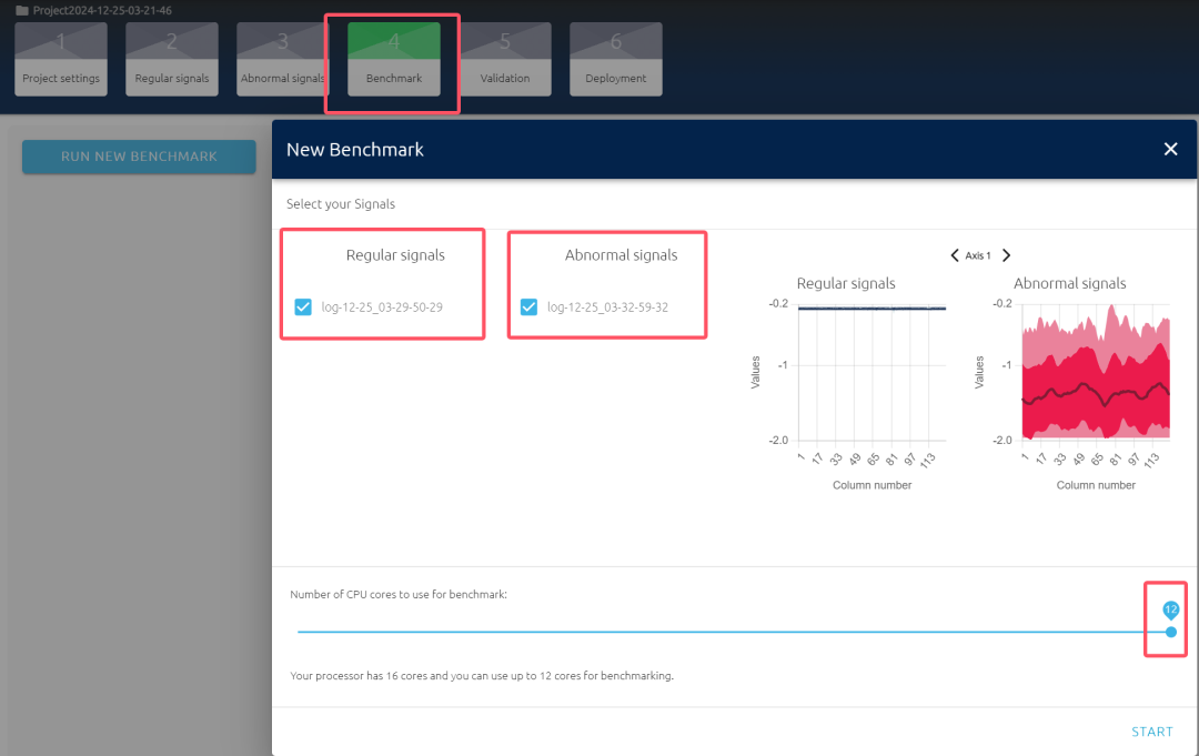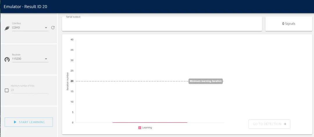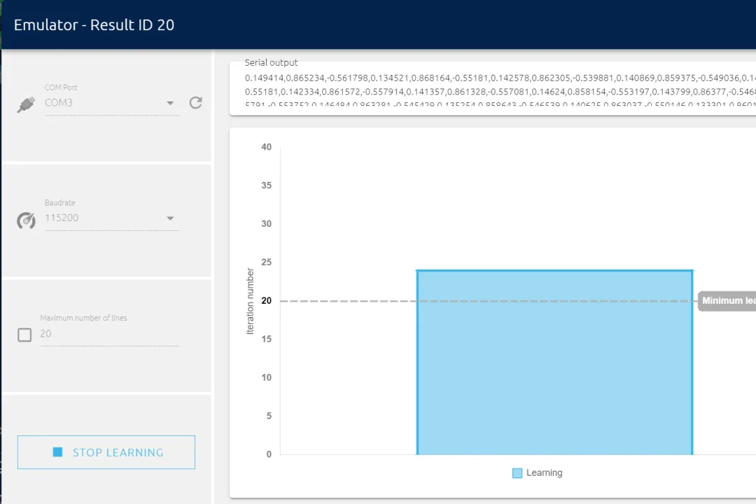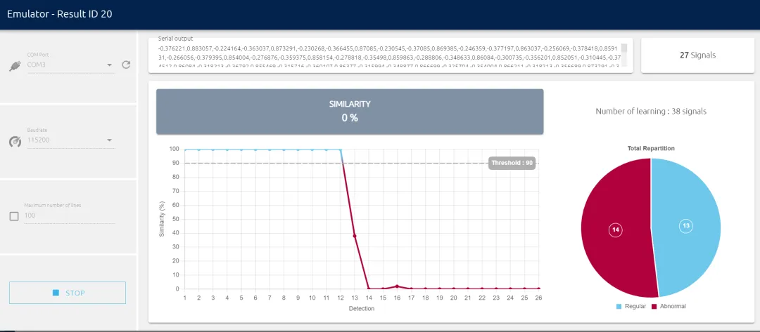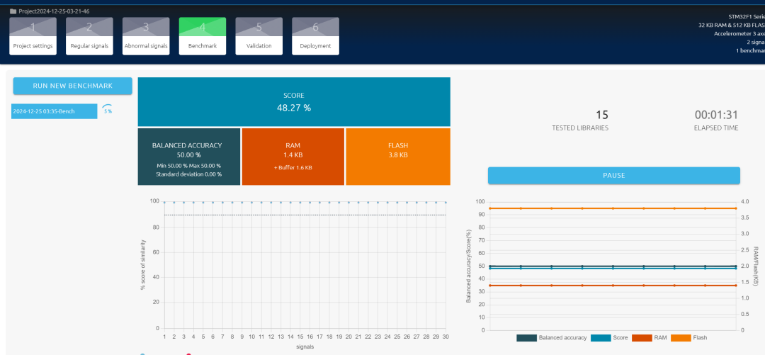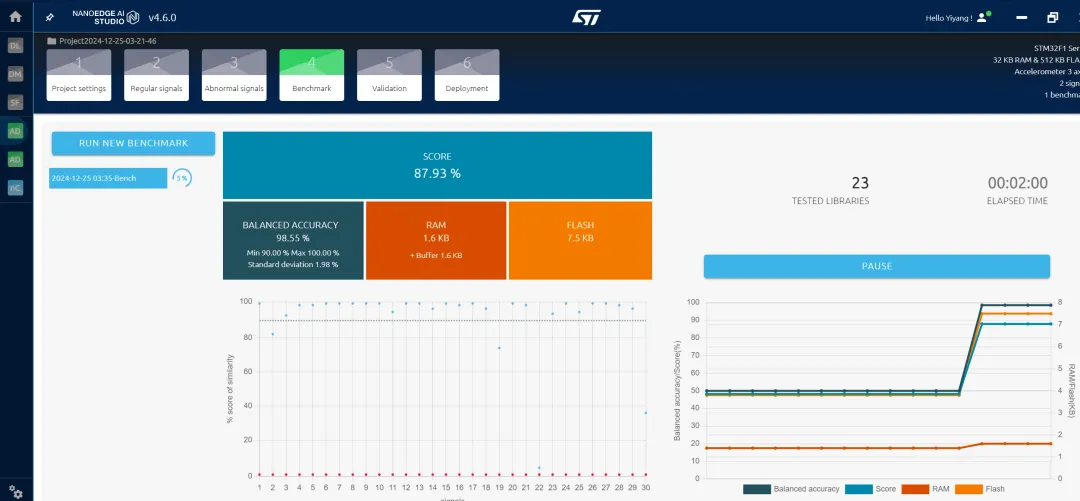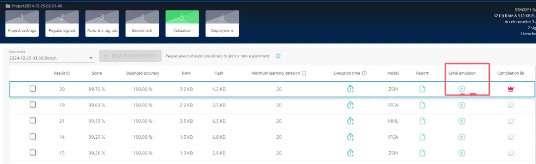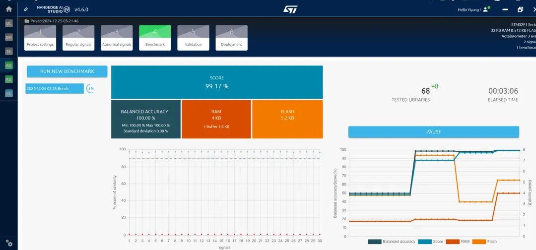 完成了数据采集之后,对采集到的正常信号和非正常信号进行模型训练。随着模型的不断训练(这里好像是NanoEdge有一个庞大的库,它不断的测试合适的模型库和老版本的区别很大)