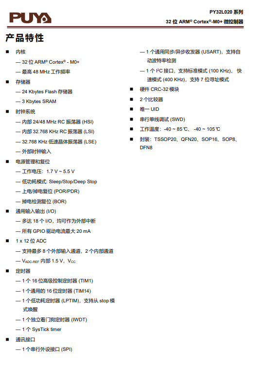 芯片提供 sleep/stop/Deep Stop 低功耗工作模式,可以满足不同的低功耗应用。PY32L020 系列微控制器适用于多种应用场景,例如控制器、手持设备、PC 外设、游戏和 GPS 平台、工业应用等。