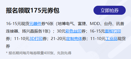 现在抓紧时间报名,即可直接领取总价值175元的专属券包,送你第一笔启动优惠,覆盖从元器件到定制加工的需求: