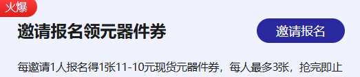 此外,每邀请1位好友参赛,邀请人立得一张11-10元现货元器件券,每人最多可领3张,数量领完即止。