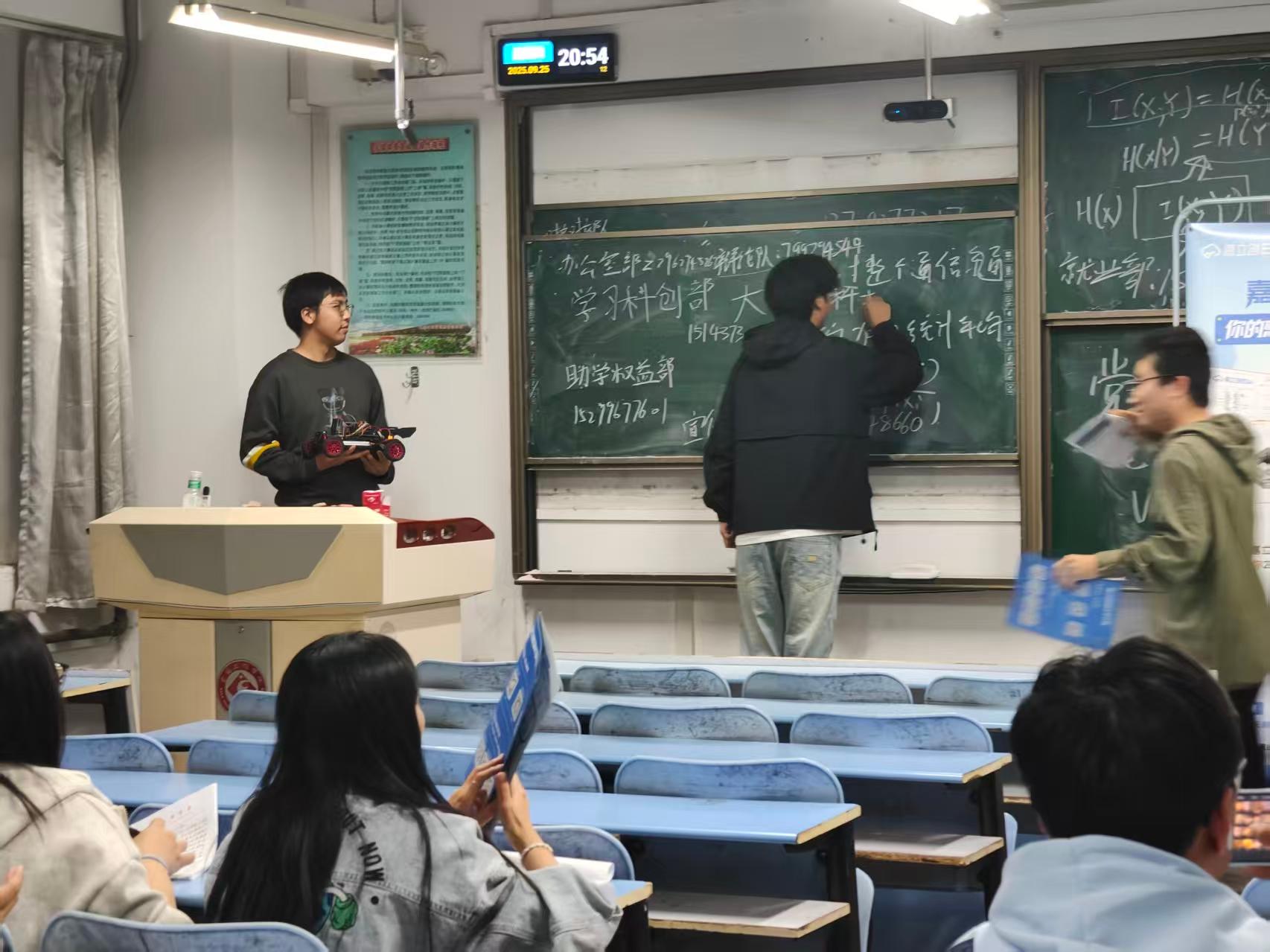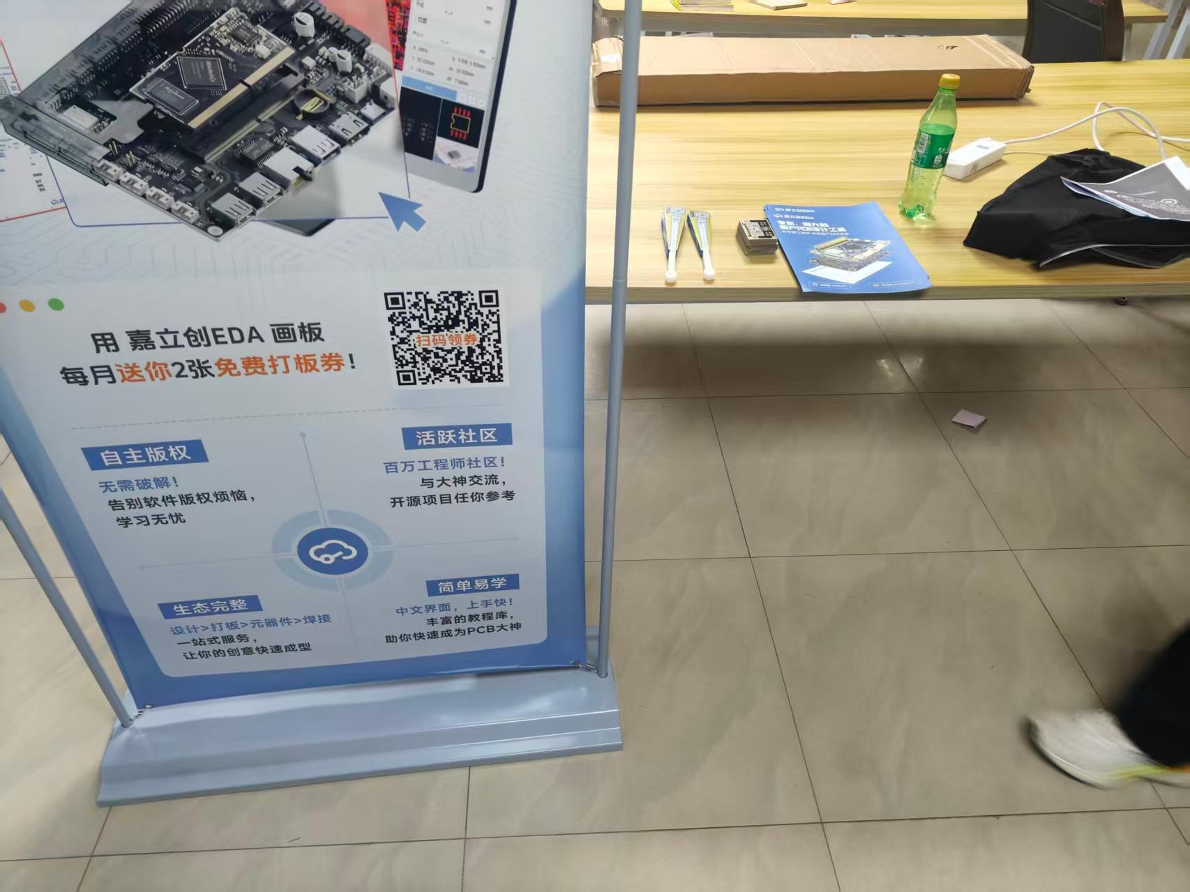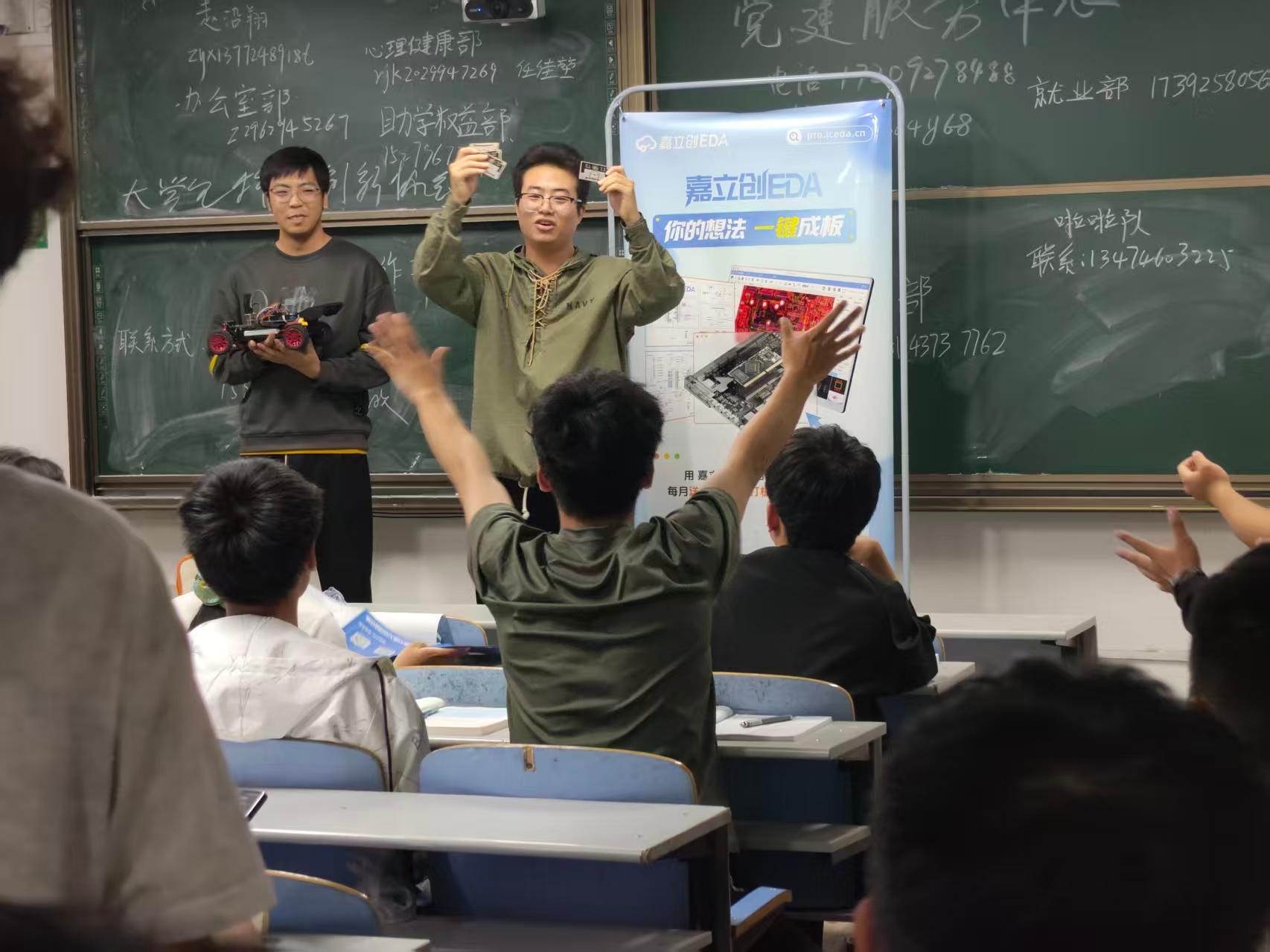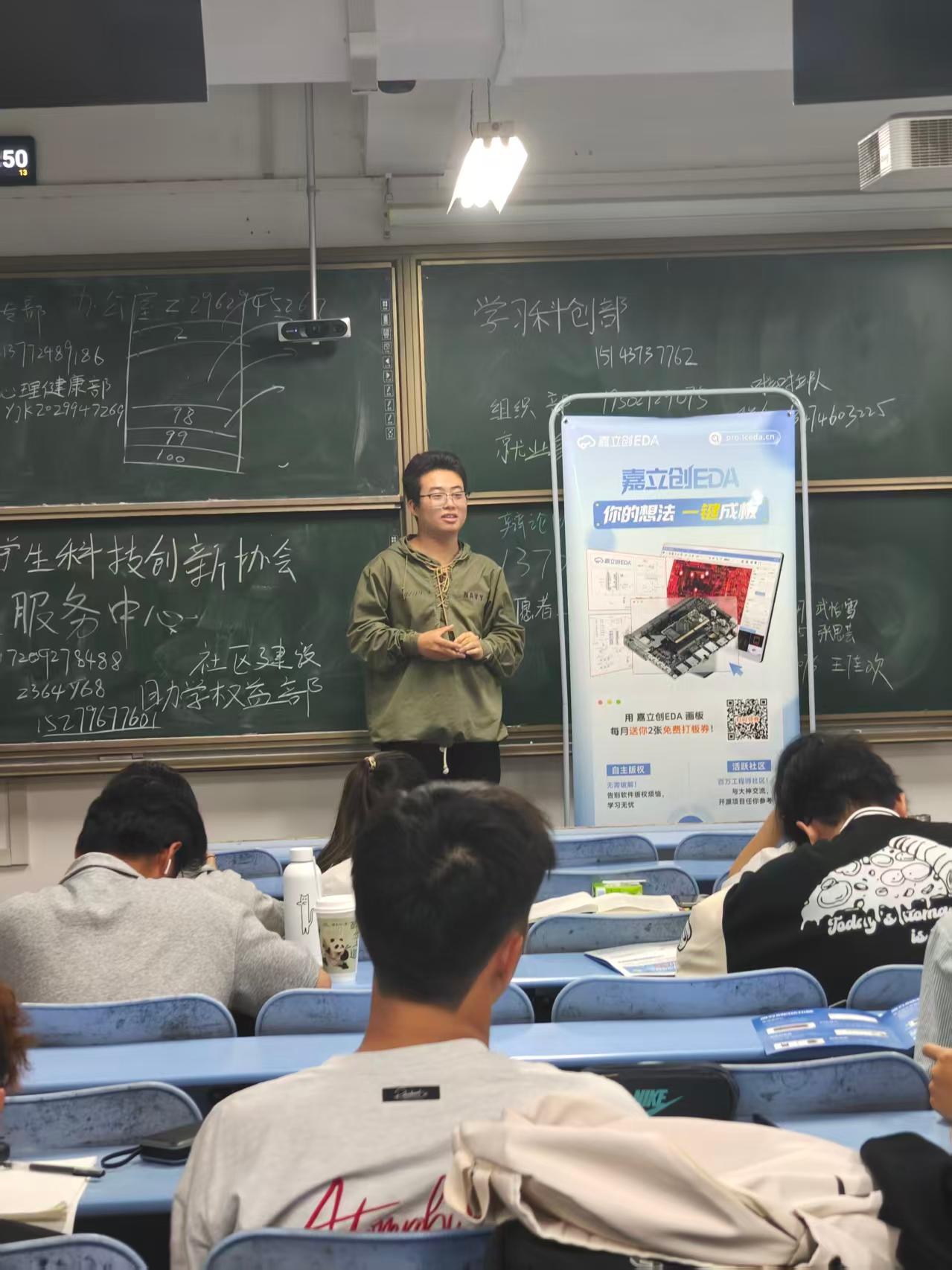 黑板上,大学生科技创新协会等部门信息旁,嘉立创EDA的展架格外醒目——“你的想法,一键成板”的标语,精准戳中了学生群体“想做但怕成本高”的痛点。从电路板设计软件的基础操作演示,到开源项目案例的分享,宣讲内容把专业工具拆解成“新手友好型”知识,让原本复杂的硬件开发流程变得清晰易懂。